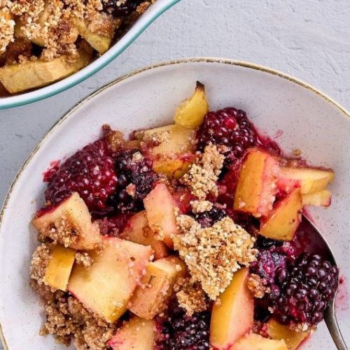 Mit einem Crumble kann man immer punkten. Ob nachmittags zum Kaffee oder als Dessert. Dieser hier kommt artgerecht mit Äpfeln und Brombeeren daher – aber kann natürlich beliebig mit anderen Obstsorten kombiniert werden.