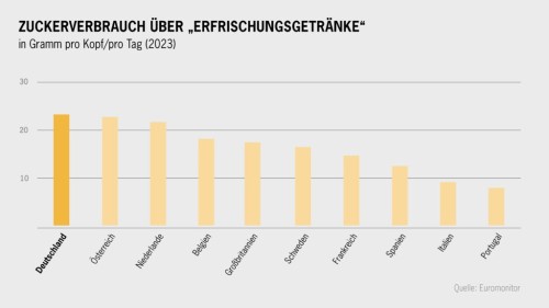 Die deutschen Werte liegen damit mehr als doppelt so hoch wie in Ländern wie Italien, wo der tägliche Zuckerkonsum über Getränke nur rund 9,5 Gramm beträgt.