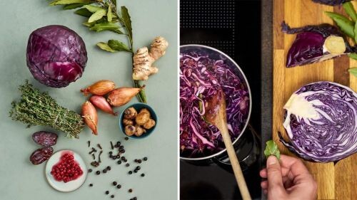 - In einem feuerfesten Topf oder Bräter etwas Olivenöl erwärmen und die Schalotten mit dem Ingwer darin anschwitzen. Den Rotkohl zugeben und für 2-3 Minuten andünsten. Die Preiselbeeren, klein gewürfelte Datteln, Wachholderbeeren, Lorbeerblätter, Zimtstange, Wasser und Salz zugeben und mit geschlossenem Deckel für 1 Stunde in den Ofen geben und schmoren.