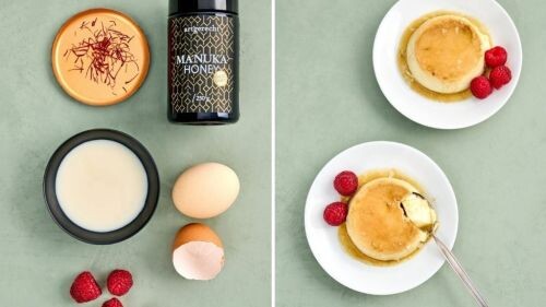 - Auf den Boden von vier ofenfesten Förmchen jeweils 1/2 TL Manuka-Honig verteilen und die Flan-Masse vorsichtig in die Förmchen gießen.